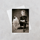 Smoking Boy with Chicken Blank Card In this humorous, whimsical and intriguing sepia-toned photograph, a young boy sits confidently on a small chair, exuding an air of defiant nonchalance. With a cigarette dangling from his lips and his arms crossed, he strikes a pose far beyond his years. Beside him stands an impressively large white chicken, its feathers pristine and its stance stoic. The juxtaposition of the boy's rebellious demeanor and the chicken's calm presence creates a captivating, almost surreal scene, capturing a moment that is both endearing and thought-provoking.