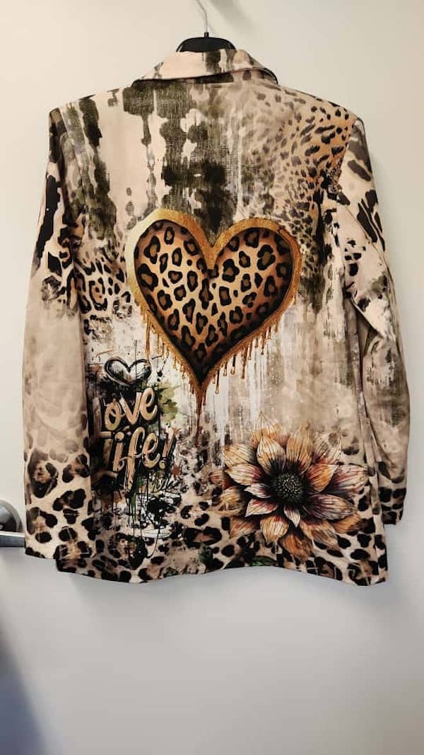 Celebrate bold femininity with this statement blazer, crafted in a rich blend of earthy tones and dynamic leopard print. Featuring oversized leopard-heart motifs, painterly brushstrokes of green and beige, and a delicate oversized floral bloom, this piece effortlessly merges wild allure with artistic elegance. The words “Love Life” are subtly integrated into the design, creating a meaningful yet fashion-forward detail. Perfect for those who embrace individuality and luxury, this blazer is a striking piece that transitions seamlessly from gallery openings to glamorous evenings. ONE SIZE FITS S TO L 100% Polyester Made in Italy.